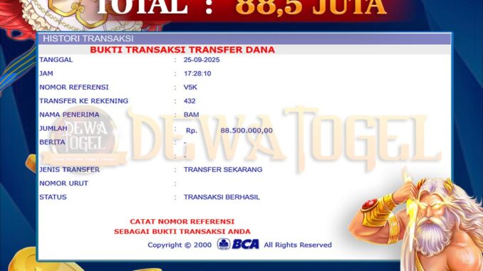 DEWATOGEL mengucapkan selamat kepada user id : SIL*** yang telah berhasil mendapatkan jackpot pada permainan SLOT DI GATES OF OLYMPUS 1000. Kemenangan sebesar Rp 88.500.000,-. telah dibayarkan LUNAS oleh pihak dewatogel kepada pemilik user id setelah yang bersangkutan mengisi formulir withdraw. Proses pencairan dana berlangsung sangat cepat hanya dalam waktu 5-10 menit sudah berada dalam rekening pemilik user id. Bukti transfer yang dapat anda lihat adalah bukti SAH / VALID yang langsung di dapatkan melalui bukti transaksi dari Bank yang digunakan untuk pengiriman dana pada rekening pemilik user id. Terima kasih kami sampaikan kepada para pengguna setia DEWATOGEL yang telah menggunakan situs kami, sebagai Bandar Terpercaya yang pastinya membayar semua kemenangan member hingga lunas. Apakah DEWATOGEL PENIPU ? Reputasi “DEWATOGEL TERPERCAYA” sudah sangat melekat. puluhan hingga ratusan ribu pengguna setia DEWATOGEL tetap menggunakan situs terbesar dan terbaik di Indonesia ini. Hapus rasa was-was dan khawatir anda, kemenangan anda berapapun PASTI dibayarkan hingga lunas.